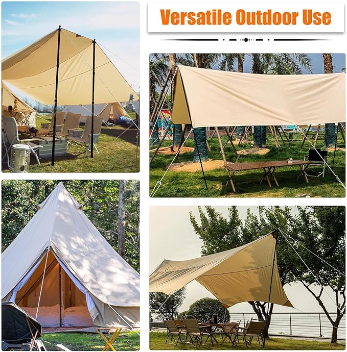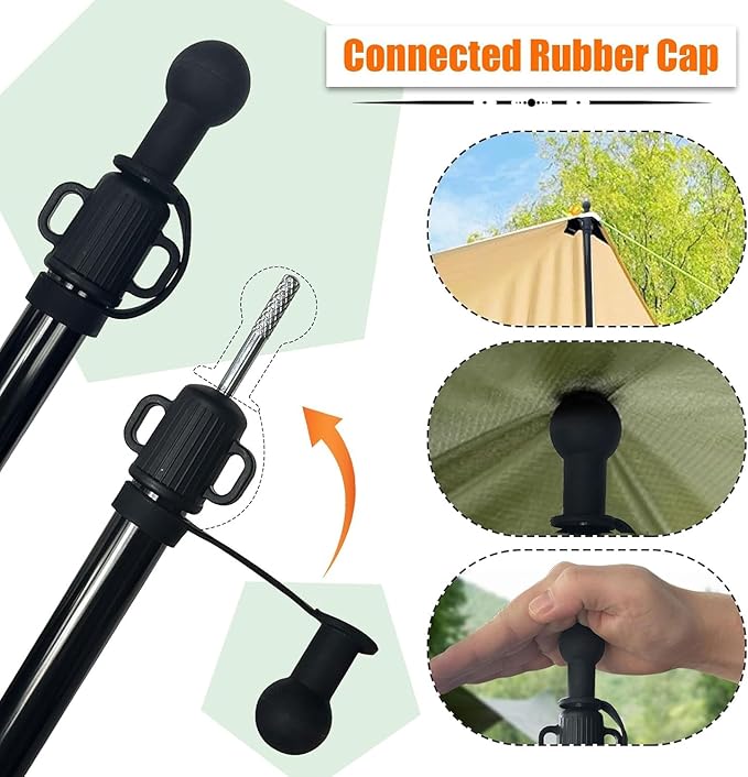 • TEAR AND SLIP-RESISTANT: Rubber caps on the top of the poles reduce sliding and can be used directly to support the tarps. The rubber caps are securely attached to the tarp poles and won't get lost. Additionally, the tips of the poles are equipped with anti-slip threads for enhanced wind protection.