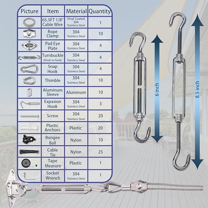 • 【Package Included】:Total 123PCS ,Included 1 x 65.5FT 1/8" Vinyl Coated Stainless Steel Cable Wire ; 4 x M6 Pad Eye ; 4 xM6 Turnbuckle; 4 xM6 Snap Hook ;10 x M5 Rope Clamp ; 10 xM3 thimble ; 10 xM3 aluminum sleeve ; 3 xM6 expansion hooks; ; 20 xScrew; 20 xplastic anchors;10 xBungee ball;25 xNyln cable Ties;1 xSocket wrench;1 xTape Measure .