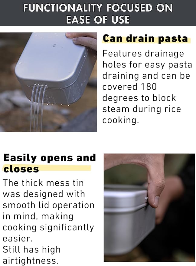 • 【Extra thick material, Durable】Compared to standard mess tins, this model is made with aluminum plates that are twice as thick (1.5mm for both the body and lid). Enjoy a higher quality mess tin with this upgraded version.