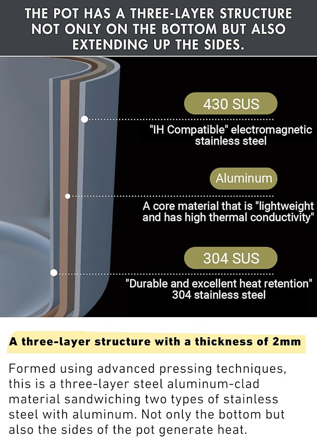 • 【Supports induction heating (IH)】The interior features corrosion-resistant 304 stainless steel, an aluminum core for efficient heat conduction, and an 304 SUS exterior, making it compatible with IH cooking.