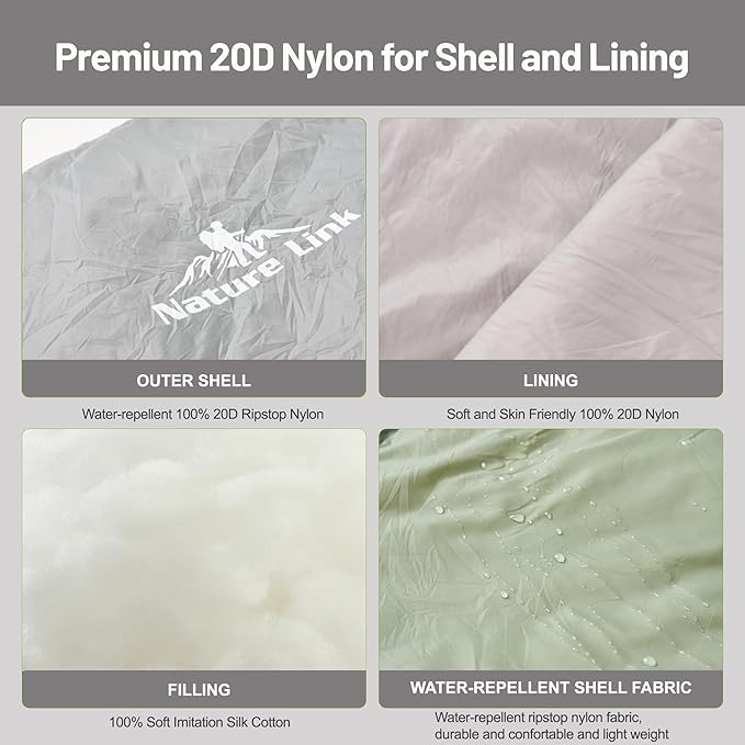 • DURABLE NYLON SHELL AND LINING: This sleeping bag is made of 20D ripstop nylon for shell which is water-repellent, and 20D soft nylon for lining, which is comfortable and skin-friendly, provide you with a warm relaxing sleep.