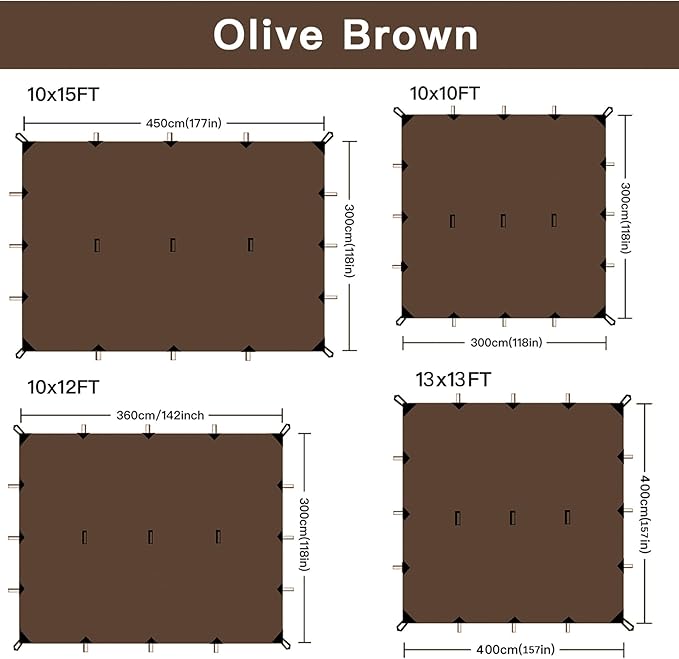 • . MULTI-FUNCTIONAL: The camping tarp rain fly can be widely used as survival tarp, hammock rain fly, outdoor kitchen cover, simple tent, tent footprint, picnic blanket, ground sheet , instant shade, etc