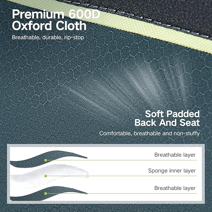 • 【CAMPING CHAIR With Premium 600D OXFORD FABRIC】 The lawn chair with ergonomic padded back, seat and armrest provide max comfort for your body. The durable double-layer 600D padded breathable oxford fabric with powder-coated steel tube frame enables you deserve a comfortable and safe chair.