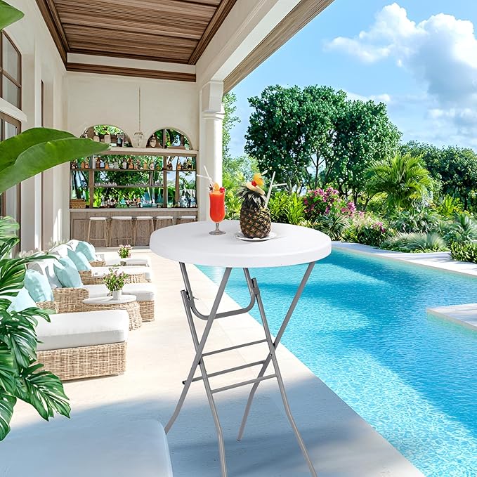 28in Cocktail Table White High Top Folding, Round Portable Bar Height Folding Table with Removable Legs, Indoor Outdoor Banquet for Parties, Commercial, Speech, School