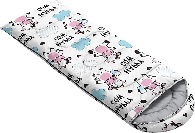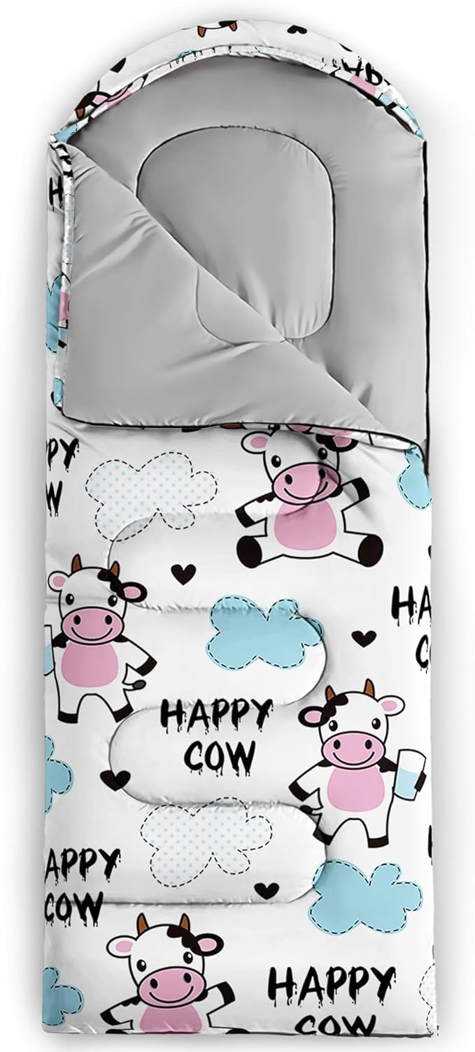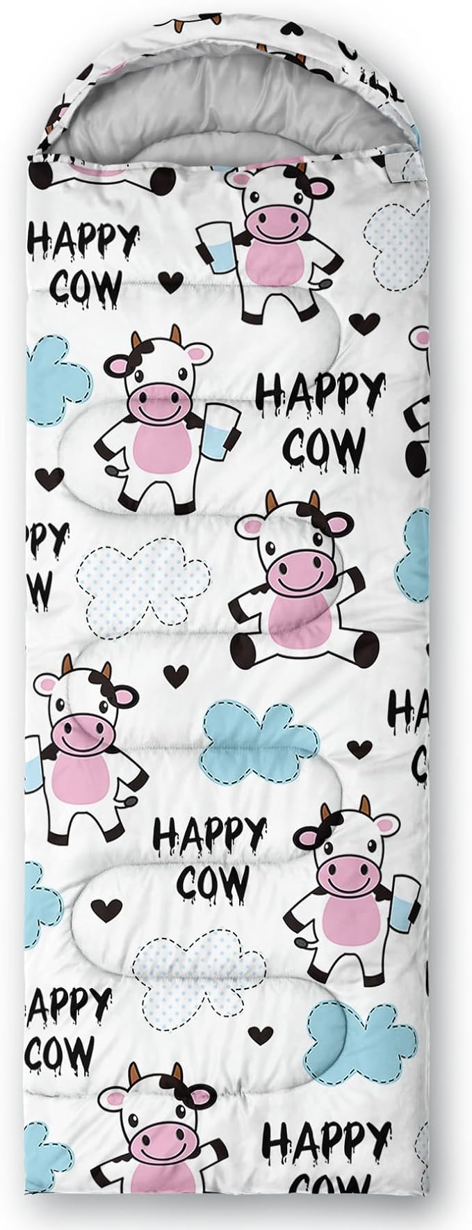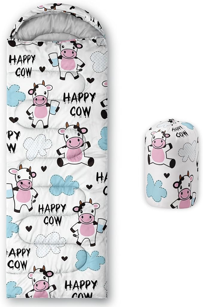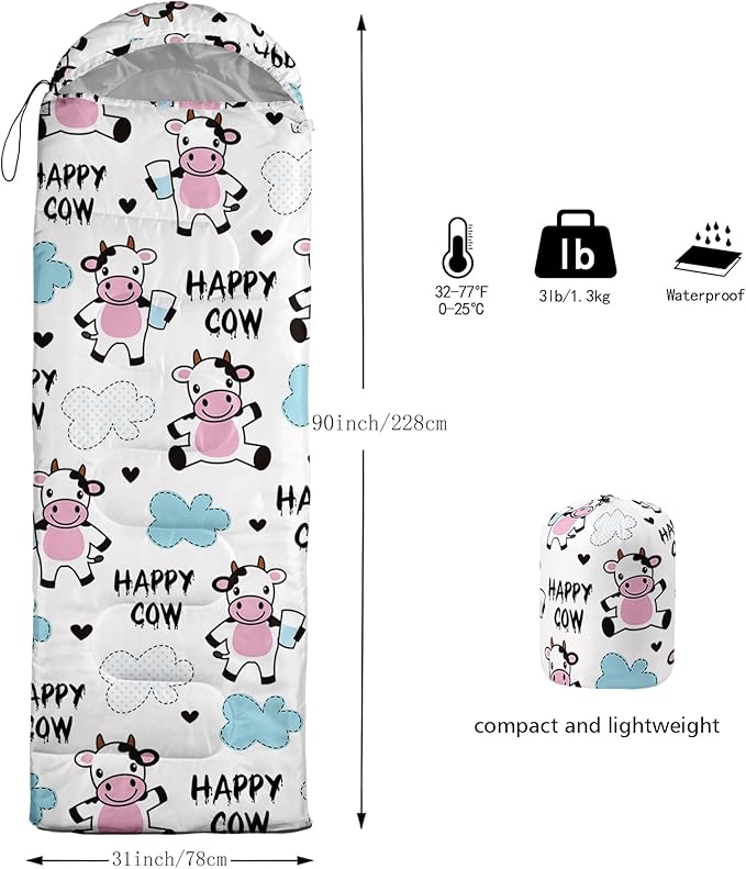 • 【Fits For 3 Seasons】: Size - 31 by 90 inches (W x D). Our Cartoon Milk Cow sleeping bag can be used in 3 seasons with a design temperature of 32℉-77℉(0℃-25℃). These Sleeping bags also have a weather resistant waterproof design to keep you warm and prevent you from any dampness.