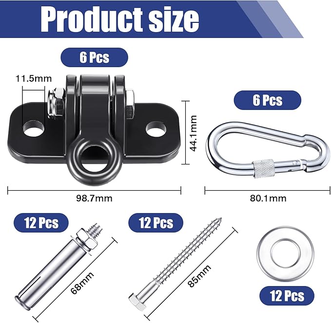 • Ample Quantity and Versatility: each package comes with 6 swing hangers along with 6 locking hooks, 12 screws, 12 expansion bolts, and 12 washers; These swing hangers are versatile and suited for many applications, such as gymnastics rings, porch swings, yoga swings, punching bags, boxing equipment, hammocks, swing chairs, and more