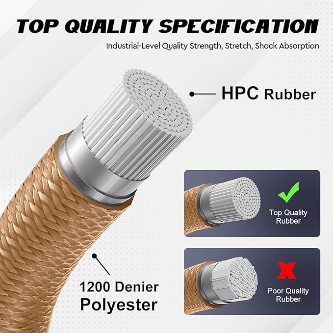 • HIGH QUALITY SPECIFICATION – Including The 1200 denier polyester shell & 100% HPC rubber core. This means Industrial-level quality strength, stretch, shock absorption, and longevity that you can depend on, including long-lasting resistance to the elements and ultra-violet (UV) sunlight.