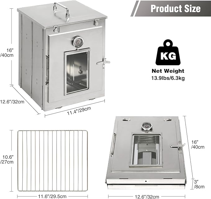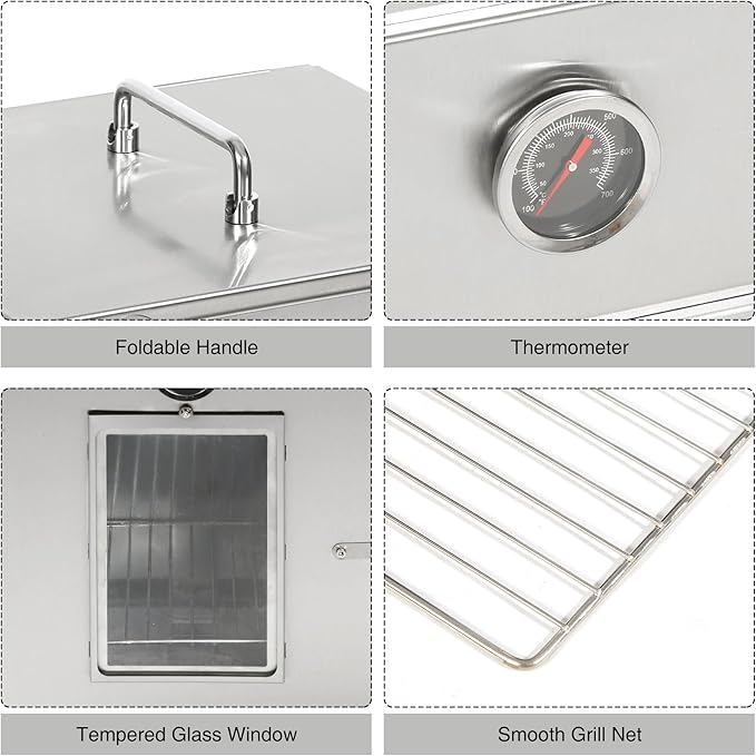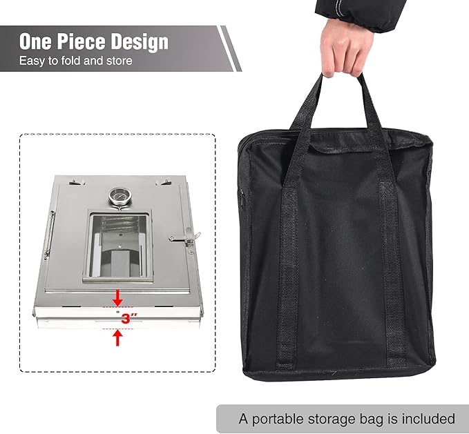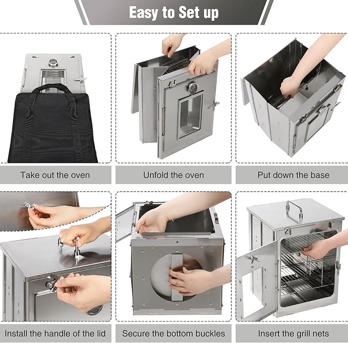 • Easy Installation: Featuring an integrated design, this foldable oven allows for effortless setup and takedown without the need for tools. The top lid is equipped with a foldable handle for convenient lifting and transportation.