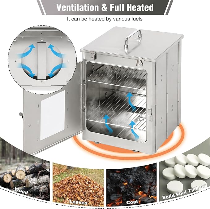 • Premium Material: Our foldable camping oven is crafted from high-quality 430 stainless steel, ensuring durability with excellent heat resistance and rust prevention, providing you with a reliable cooking experience.