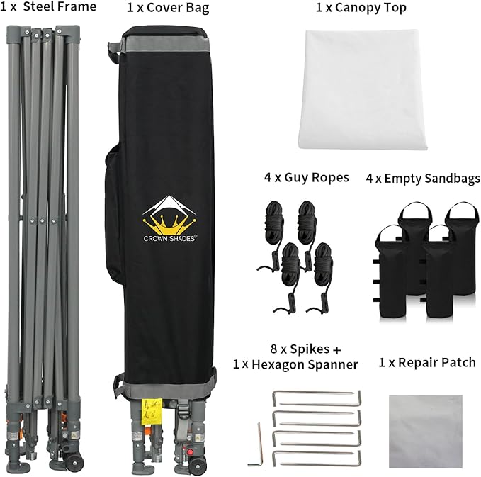 • HIGH GRADE STEEL FRAME - The durable, high-grade, corrosion-resistant steel truss frame with hardened through bolts comes pre-assembled and can be set up without any tools. Engineered to support up to 120 lbs. distributed across the frame, it ensures robust and reliable performance. The extended ceiling assembly and upgraded high peak design make it easier for rainwater to run off, preventing water pooling on the canopy. Perfect for extended outdoor use at markets, festivals, and exhibitions