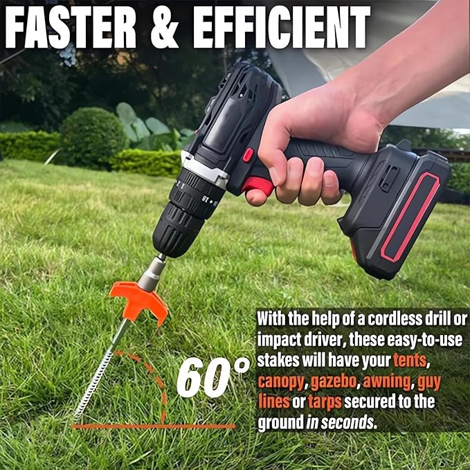 • 🔥 With the help of a cordless drill or impact driver, these easy-to-use stakes will have your tents, canopy, gazebo, awning, guy lines or tarps secured to the ground in seconds.
