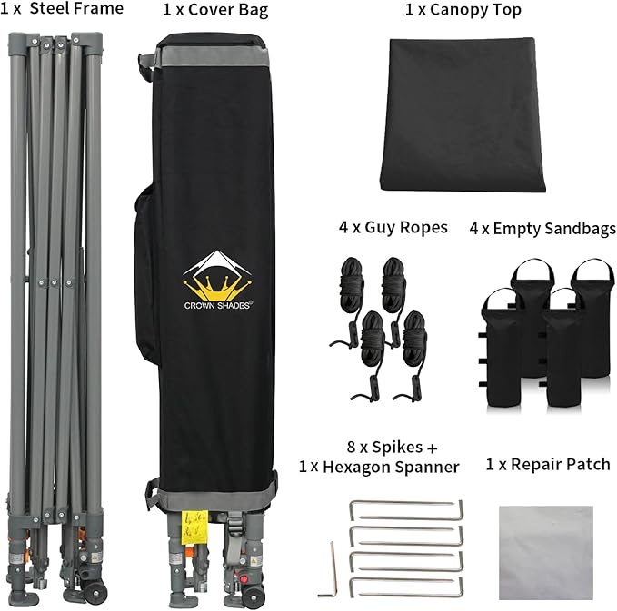 • HIGH GRADE STEEL FRAME - The durable, high-grade, corrosion-resistant steel truss frame with hardened through bolts comes pre-assembled and can be set up without any tools. Engineered to support up to 120 lbs. distributed across the frame, it ensures robust and reliable performance. The extended ceiling assembly and upgraded high peak design make it easier for rainwater to run off, preventing water pooling on the canopy. Perfect for extended outdoor use at markets, festivals, and exhibitions