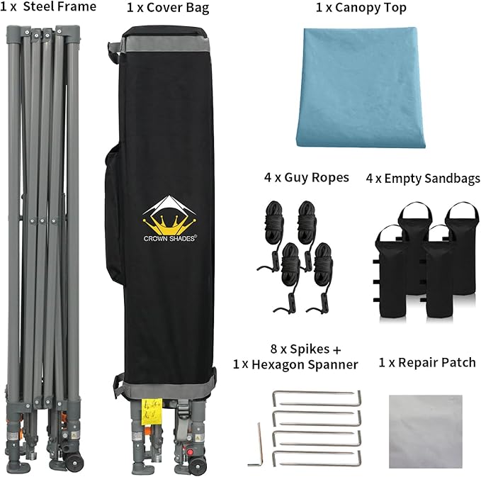 • HIGH GRADE STEEL FRAME - The durable, high-grade, corrosion-resistant steel truss frame with hardened through bolts comes pre-assembled and can be set up without any tools. Engineered to support up to 120 lbs. distributed across the frame, it ensures robust and reliable performance. The extended ceiling assembly and upgraded high peak design make it easier for rainwater to run off, preventing water pooling on the canopy. Perfect for extended outdoor use at markets, festivals, and exhibitions