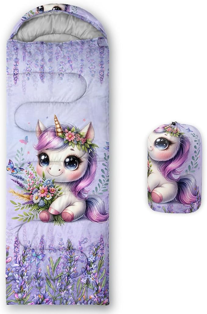 • 【Fashion Design】This waterproof and lightweight sleeping bag is designed with a cartoon unicorn pattern.The unicorn holds flowers and is surrounded by butterfly flower bushes,adding a comfortable atmosphere.It is very suitable for use during spring camping.
