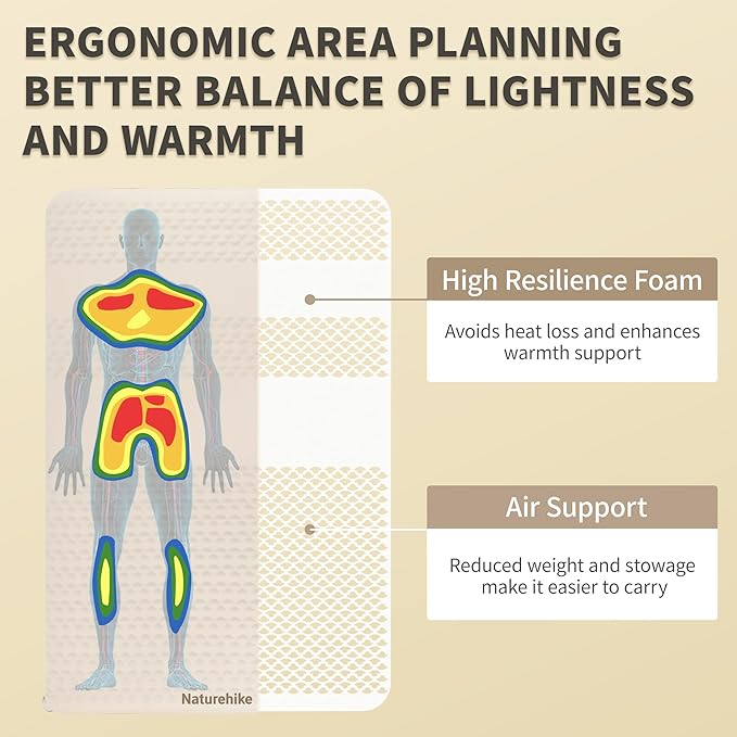 • UNIQUE FOAM CUT CONSTRUCTION: The Naturehike Sleeping Pad is filled with slow rebound foam that conforms to your body's curves and provides extra support for your lower back, hips, shoulders, neck and legs. The unique foam cutting process makes the mattress lighter than other mattresses of the same size. Single weight: 1.7 kg / 3.2 lbs, Double weight: 3 kg / 6.6 lbs. Also, the smaller storage volume makes it easy to take on the go