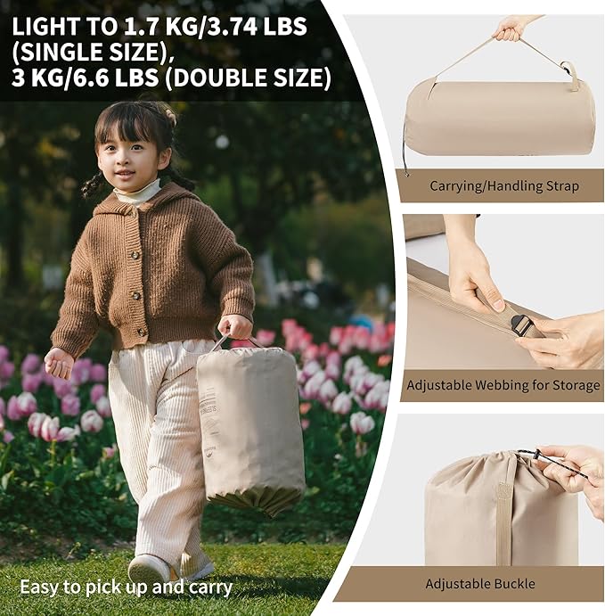• WIDE RANGE OF USAGE SCENARIOS: There are two styles of sleeping mats to choose from. Single model: 200*76cm/ 78.7*30’’, double model: 200*132cm/ 78.7*52’’. You can fold the air mattress after pumping and then roll it up, tie it with a strap and then put it into the storage carry bag. The carry bag can be carried or carried on your back, convenient for you to go to the following scenarios: camping / outdoor / home / travel / car