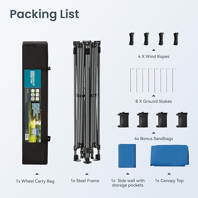 • Complete Package with Customer Assurance: This package includes a commercial-grade tent with height-adjustable legs, removable sidewalls with storage pockets, stakes, guy ropes, and a wheeled carrying bag for easy transport. We offer a one-year limited warranty for the frame and six months for fabrics and accessories, reflecting our commitment to quality and customer satisfaction.