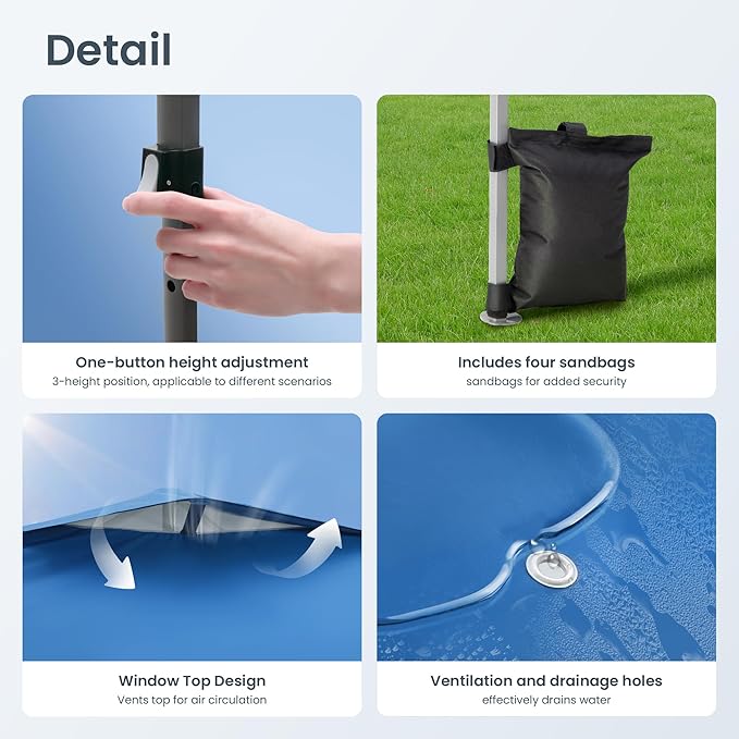 • Effortless One-Person Setup: Our innovative patented central locking system allows for quick setup by a single person in seconds—no tools required! Just open the canopy, press the button, and adjust the height for immediate shade at any outdoor event.