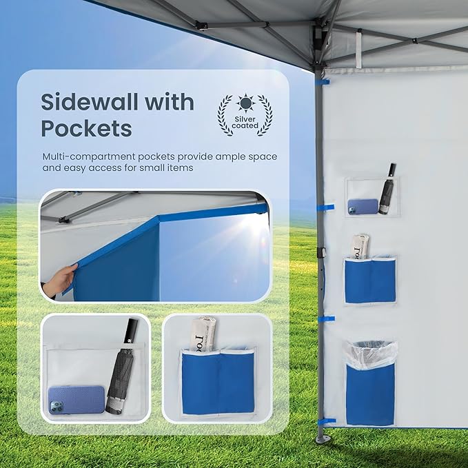 PHI VILLA Canopy Tent 10x10 Pop Up Canopy Outdoor Shade with Pockets Sidewall, Easy Up Sun Shelter with One Person Set Up Center Lock, Portable Instant Camping Beach Canopy Tents, Blue