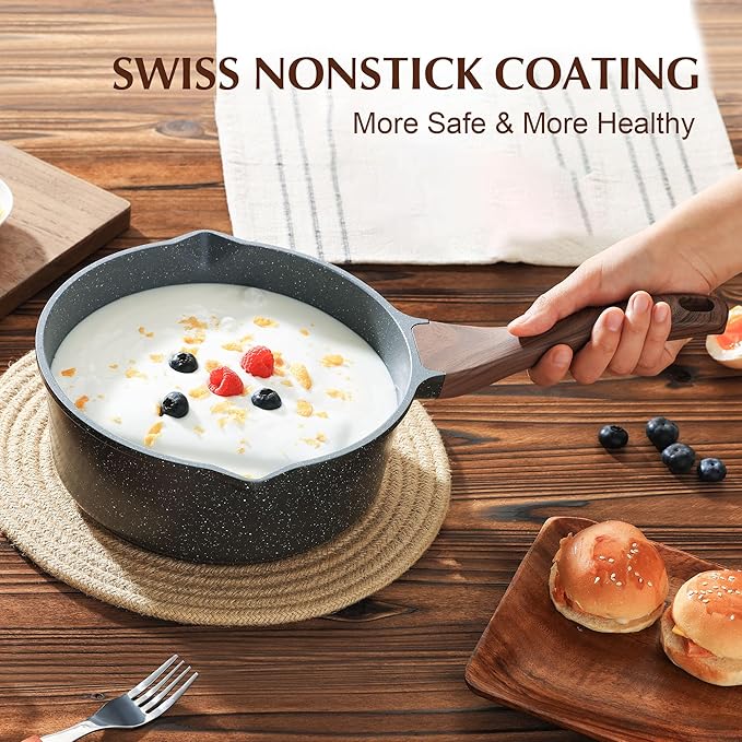 • Glass Lid & Stay-cool Handle - Long-lasting tempered glass lid makes this induction saucepan with lid convenient to see the cooking status and limits splashes on your stove. Woodgrain bakelite handle is comfortable to grip and stays cool while cooking. Oven safe to 302°F.