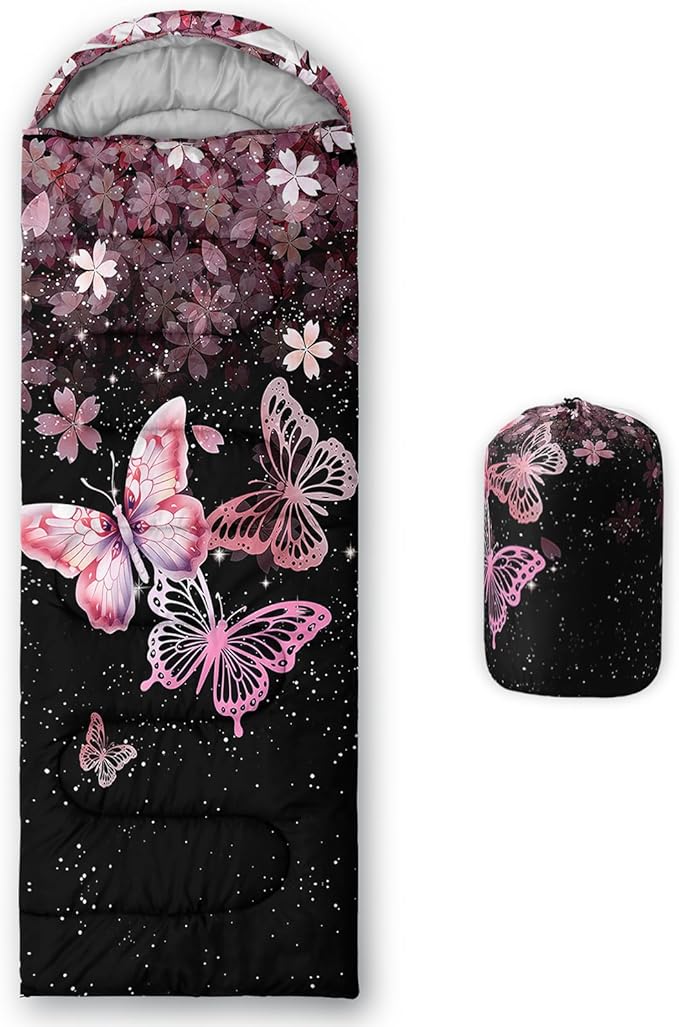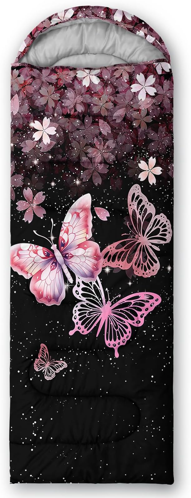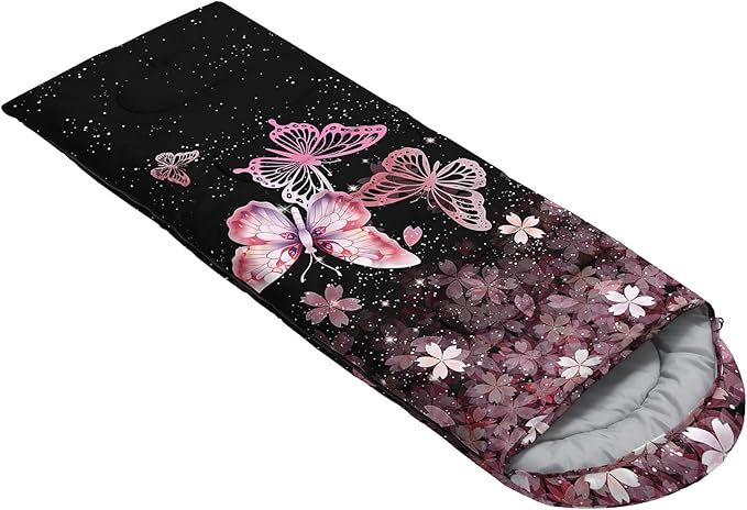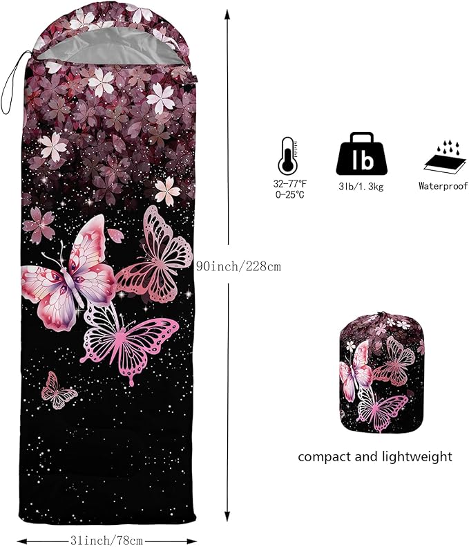 • 【Fits For 3 Seasons】: Size - 31 by 90 inches (W x D). Our Pink Butterfly sleeping bag can be used in 3 seasons with a design temperature of 32℉-77℉(0℃-25℃). These Sleeping bags also have a weather resistant waterproof design to keep you warm and prevent you from any dampness.