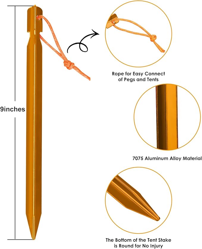 • 4. [ No ACCIDENTAL INJURY ] The bottom of the ground nail is round rather than sharp, and the aluminum tent stakes has a comfortable grip, which can effectively avoid accidental injury.