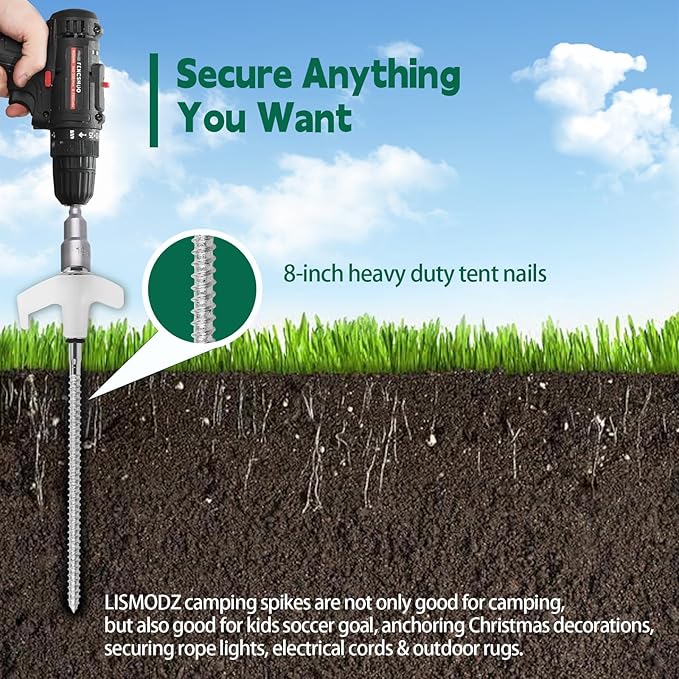 • Secure Anything You Want: LISMODZ camping spikes are not only good for camping, but also good for kids soccer goal, anchoring Christmas decorations, securing rope lights, electrical cords & outdoor rugs