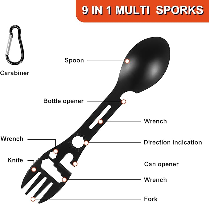 • Multi-functional Camping Sporks - Made of stainless steel, it can be a spoon, fork, bottle opener, can opener, or positioning wrench which will add more functions to your camping travel and feature a hole to attach it to a backpack with a keychain for portability