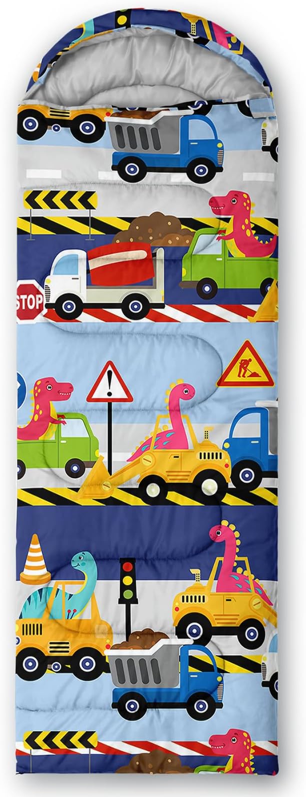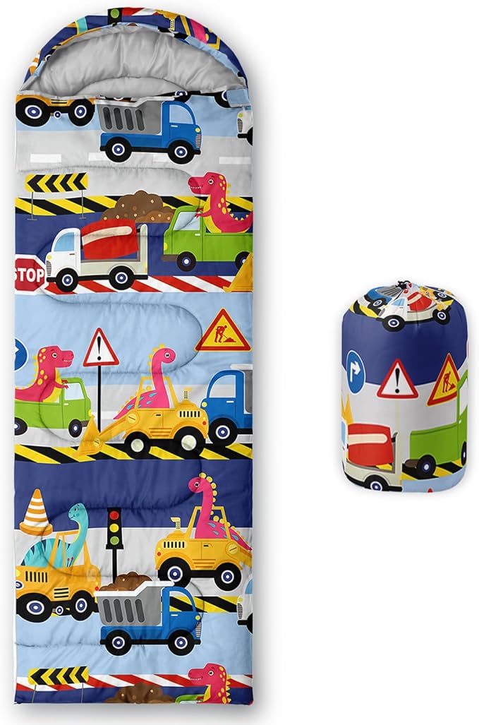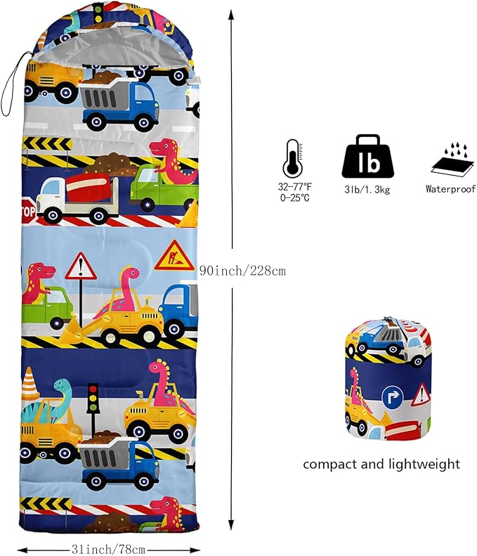• 【Fits For 3 Seasons】: Size - 31 by 90 inches (W x D). Our Construction Dinosaur sleeping bag can be used in 3 seasons with a design temperature of 32℉-77℉(0℃-25℃). These Sleeping bags also have a weather resistant waterproof design to keep you warm and prevent you from any dampness.