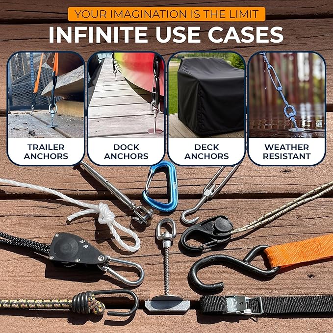 • INFINITE USE CASES & REPURPOSABLE - Effortlessly relocate or repurpose your anchors when needed. Release tension on the base, rotate, and uninstall as easily as you installed them, offering a versatile and multi-use solution for different trailer, deck or dock setups.