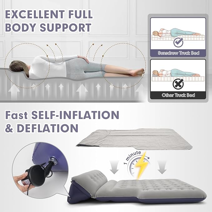 • 【Integrated Pillow Design】Choose Sunsdrew Truck Bed Air Mattress with an integrated pillow design to provide additional neck and head support, removing the necessity for carrying extra pillows and maximizing space utilization in your truck bed. Opt for a mattress that can be effortlessly deflated and rolled up into a compact size for easy storage and transportability, ensuring it is perfect for on-the-go adventures and outdoor activities.