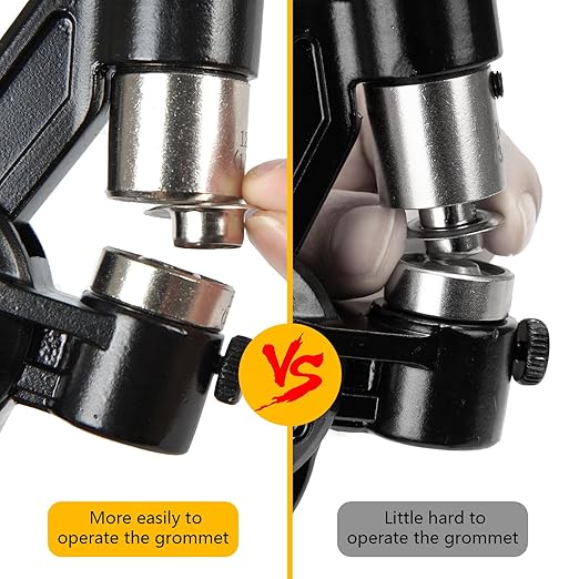 • Ease of use without Hole Punching: The grommet tool kit simplifies the process with magnetic dies that seamlessly align the grommets without the need for pre-punching holes. Save time by placing the grommet in the mold and pressing to complete the operation.
