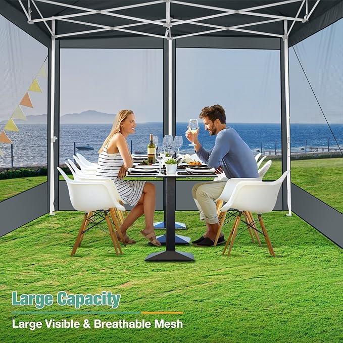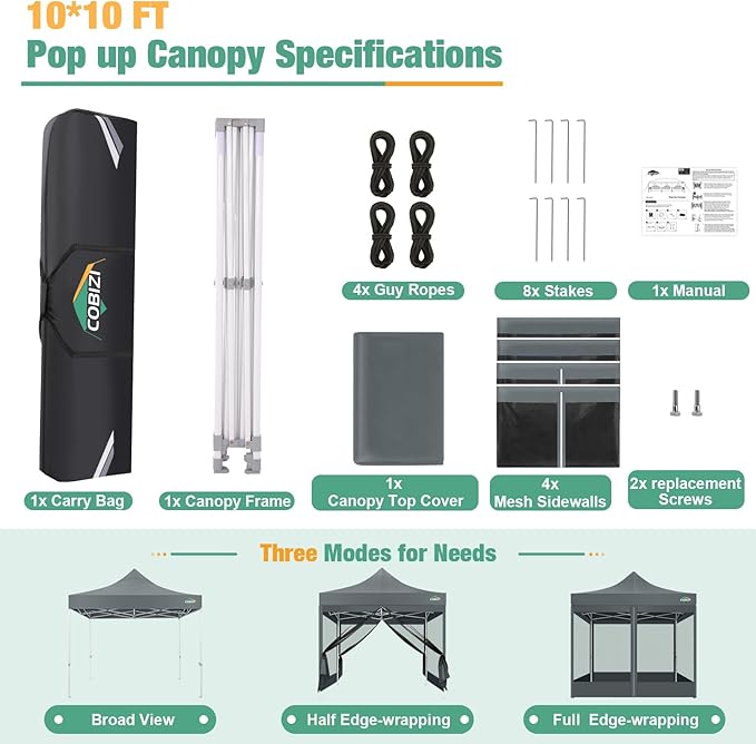 • Easy to Assemble & Portable: COBIZI 10x10 pop up tent is quick and easy to set up. It takes just a minute for 1-2 people to assemble or disassemble this pop up screen tent. The 10x10 commercial canopy tent includes a 600D Oxford cloth carry bag for easy transportation, making it ideal for parties, camping, beaches, craft shows, and farms. When not in use, simply fold the frame, sidewalls, and top neatly, and store everything in the carry bag for easy storage.