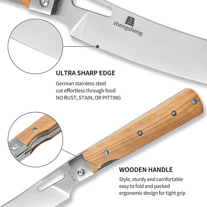 Folding Chef Knife with Nylon Pouch 4.8” Ultra Sharp 440A Stainless Steel Blade Natural Olive Handle Pocket Foldable Japanese Style Kitchen Knife for Outdoor Camping BBQ trip Cooking.