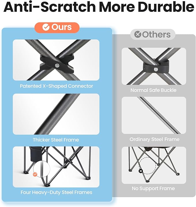 • 【Sturdy Material】: This camping chairs for adults has hammer tone powder coating that can prevent corrosion and fading. Four heavy-duty steel frame was added to the bottom of the chair and enforce stability. Sturdy steel frame construction make it can support up to 450lbs/200kg.The 600D Oxford fabric is resistant to tears and abrasions, ensuring that this camp chair will last for years to come.