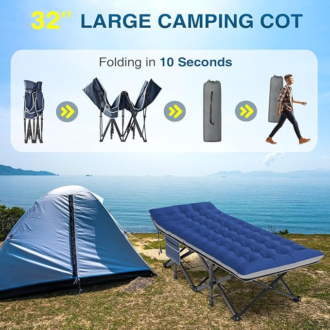 • Effortless 10-Second Setup: Maximize your adventure time with our cot's innovative folding system. Set up and fold in just 10 seconds, no tools required! This quick assembly means more time to explore, relax, and enjoy nature, making it ideal for every outdoor enthusiast who values convenience and efficiency.