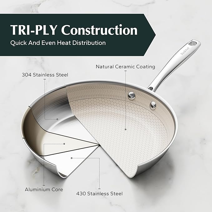 • FAST EVEN HEATING: This ceramic cookware set has tri-ply stainless steel construction for rapid and even heat conduction. The three-layer design locks in heat to preserve flavor and texture. The ceramic frying pan heats up quickly and distributes heat uniformly, ideal for precision cooking