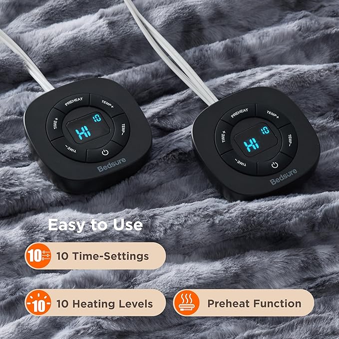 • CUSTOMIZABLE WARMTH: Fast-heating technology with 10 heating levels and 10 time-settings for personalized comfort. Queen size has preheat function, so just place on your bed 25 minutes before sleep for a toasty welcome this winter