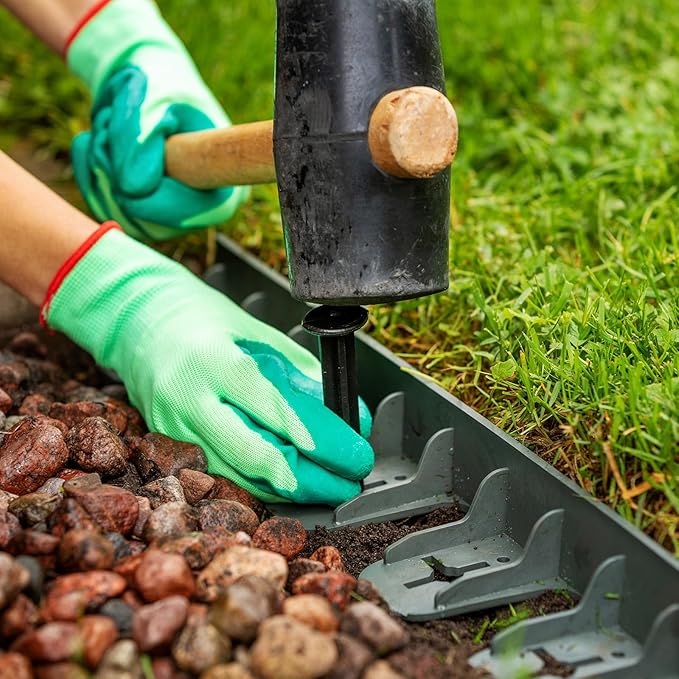 • Easy to Install: Aim the garden edging stakes at the location that needs to be fixed, and rotate it hard to easily fix it on soft soil or grass. For hard soil or building construction, you can use a hammer to hammer it in and fix it.