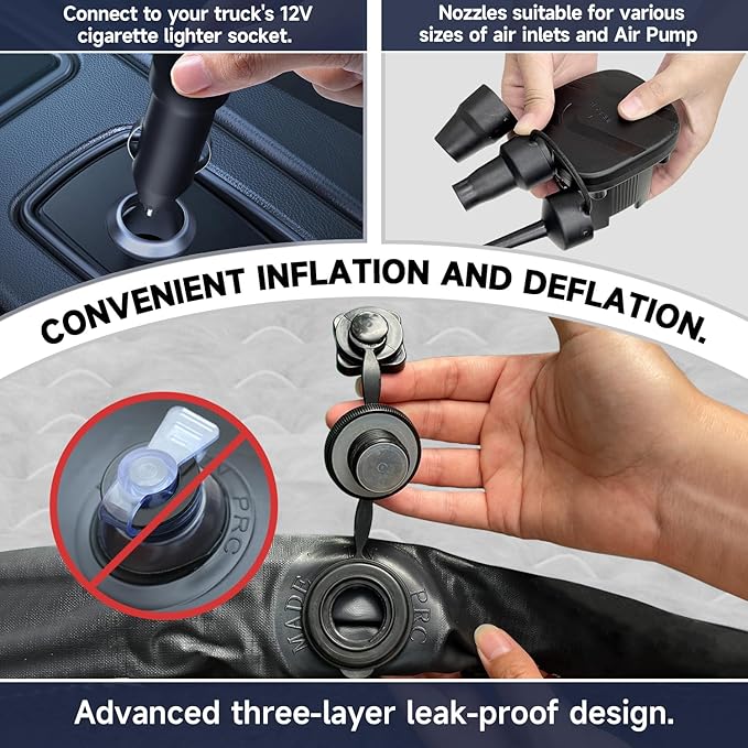 • Clever T-Shaped Design: The innovative T-shaped design of the pickup truck air mattress perfectly matches the dimensions of the truck bed, maximizing space while meeting needs and providing a more stable and comfortable user experience. Additionally, the surface and bottom of the mattress are made of non-slip material, ensuring that users do not slide while sleeping, enhancing safety and stability during use.