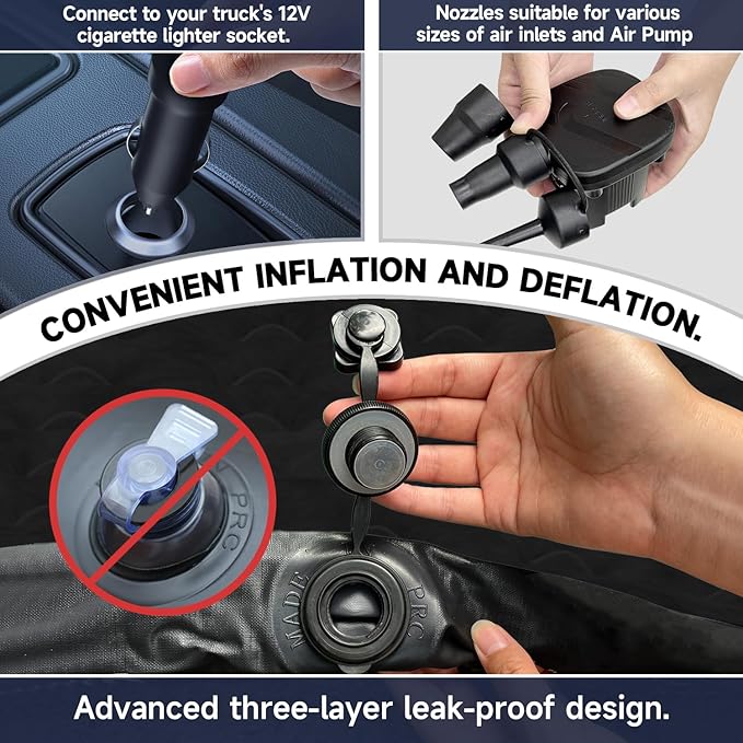 • Clever T-Shaped Design: The innovative T-shaped design of the pickup truck air mattress perfectly matches the dimensions of the truck bed, maximizing space while meeting needs and providing a more stable and comfortable user experience. Additionally, the surface and bottom of the mattress are made of non-slip material, ensuring that users do not slide while sleeping, enhancing safety and stability during use.