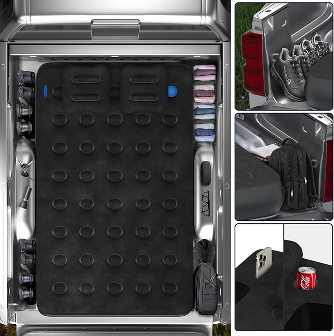 • 【Unique design】 Our truck air mattress features a design that fits between the wheels, allowing you to store your gear between the mattress and the truck bed walls. You won't end up lying on your belongings, and they won't roll over on you