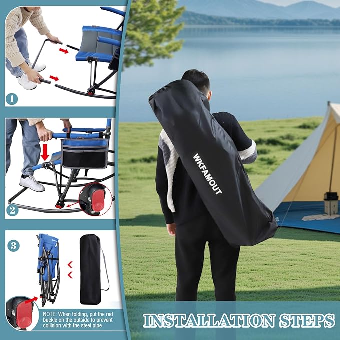 • Portable and Compact: The portable rocking chair is easy to install and remove, providing the convenience of quick seating setup for outdoor events. The unique folding design makes it easy to fold into a bundle. The camp rocker chair can be easily placed in a vehicle or other carrying tool for easy use in different outdoor locations.