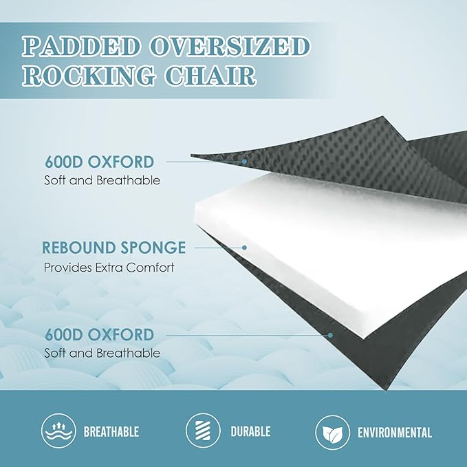 • Oversized for Comfort: The Folding Lounge Rocker is designed with an ergonomic structure that allows you to safely sway forward and back at a comfortable pace, with the thicken back&headrest and a wider seat, even larger people can enjoy a fully enveloped brisk rocking.