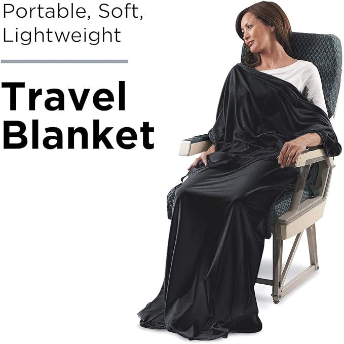 • PERFECT TRAVEL COMPANION This premium travel blanket is a must-have for your next adventure. Lightweight, breathable fabric drapes comfortably over your body for a snug fit while still providing enough stretch to allow flexible movement. Soft blanket doubles as a plush pillow when folded into the pouch for a perfect combo of features. The zippered carrying case includes a piggy-back strap that slides over a roller bag handle making multiple connections and a fast departure much easier.