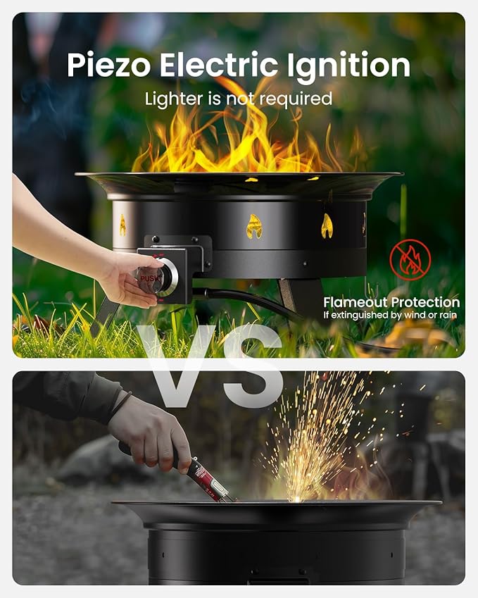 • Piezo Electric Ignition: Piezo ignition is more secure and reliable with no batteries or external power required. Simply push and hold the electroplated knob for 3 seconds, then turn to MAX and hold for 5 seconds. The propane fire pit is designed to light reliably every time.