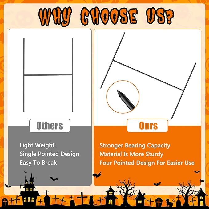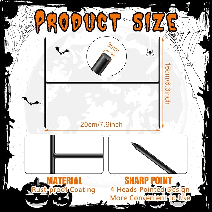 • Size and Package:There are sufficient content of H shape metal stakes, each stake measures about 7.9 x 6.3 inches/20 x 16 cm, suitable for various Halloween decorations, they are not very big so you could just store them in a small box or in your drawers when not in use.