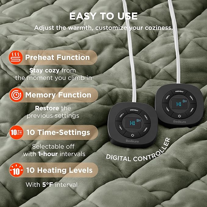Bedsure Electric Blanket Queen Size - Dual Control Heated Weighted Blanket Queen with 10 Heat Settings, Fast Heating with 10 Time Settings (84x90 inches, Olive Green)