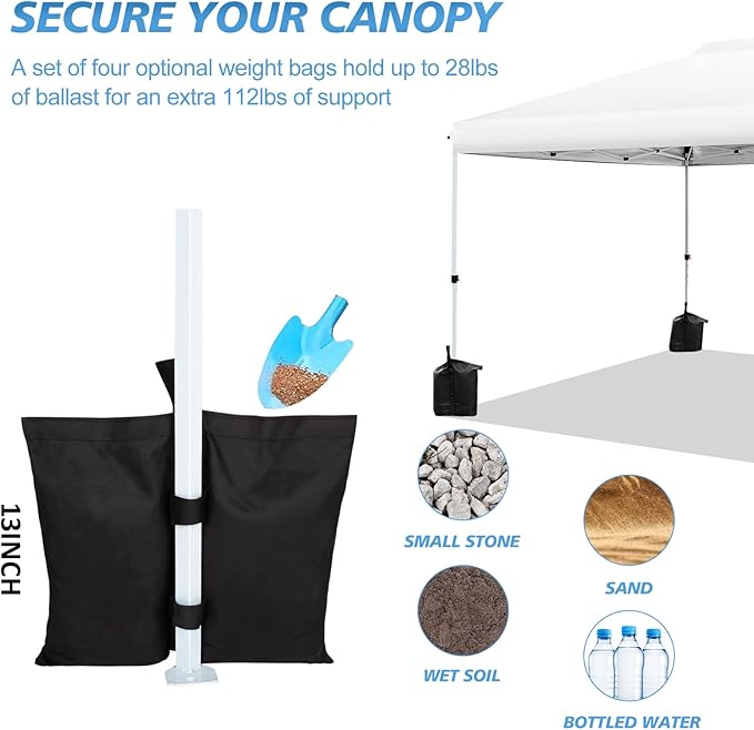 • ✅ Includes - Rolling Bag for easy transport and compact storage size fits in most vehicles. Bag features a specialized pocket for the included 8 stakes, 4 guy ropes, and 4 empty weight bags.