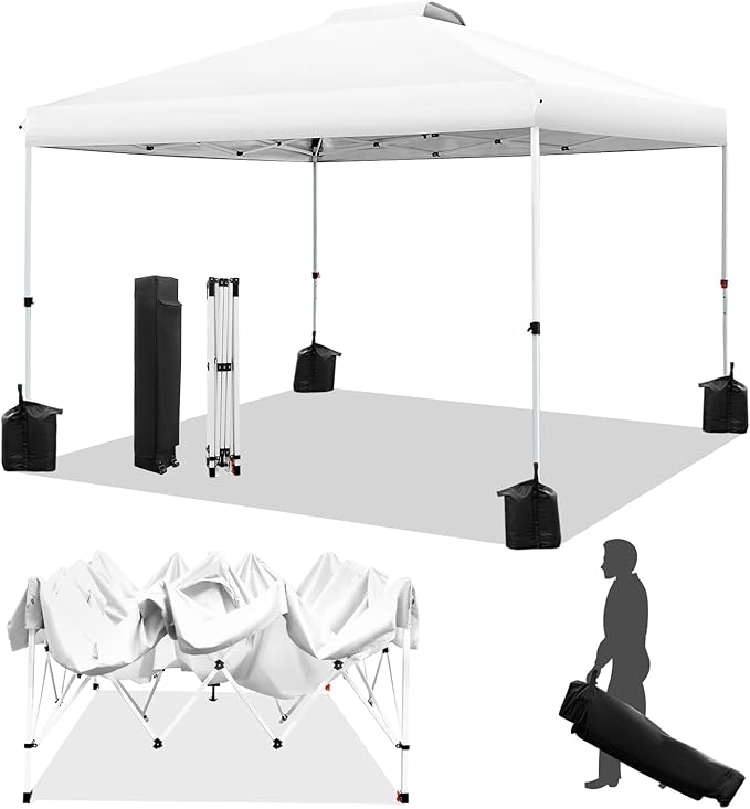 WEIZE Pop up Canopy Tent 10x10ft, 1-Button Push Setup, Instant Portable Shelter, Adjustable Height, Portable Roller Bag, 4 Weight Bags, Guy Ropes & Stakes Included, White